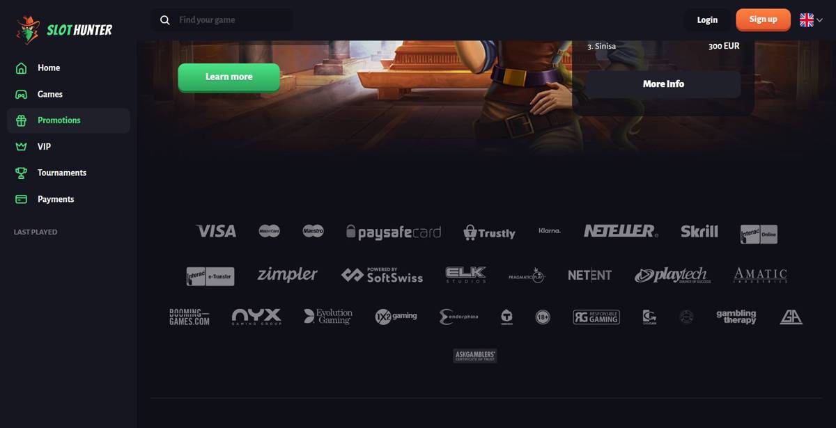 | Slot Studios | Netent, Microgaming, RelaXGaming, Pragmatic, BigTimeGaming, Yggdrasil, Thunderkick, Quickspin, 1x2 gaming, Playngo, Spinomenal, NolimitCity, TomHorn, IsoftBet, 4thePlayer, PG Soft, Wazdan, Playtech, IronDog, Push Gaming, Golden Hero, Elk Studios, Booming Games, Playson, Kalamba, Oryx, High 5 Games, TrueLab, Northern Lights, Fantasma, Betsoft, Electric Elephant, Endorphina, Gamomat, STHLM, Jade Rabbit, Spearhead, MaxWin, RedTiger, Silverback, Hacksaw, Swintt, Givme | |