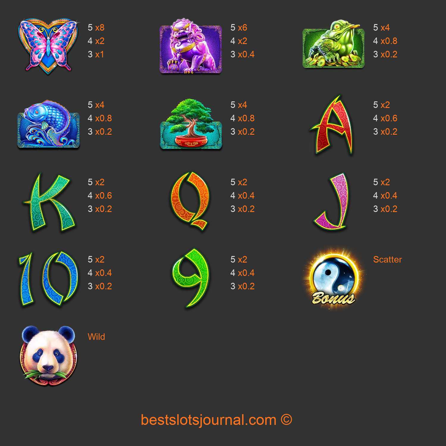 Wild symbols have become a critical aspect of any video slot after some time. Panda's Fortune 2 , as you may have realized, provides this symbol in place. Wild looks like a panda's head chewing grass.